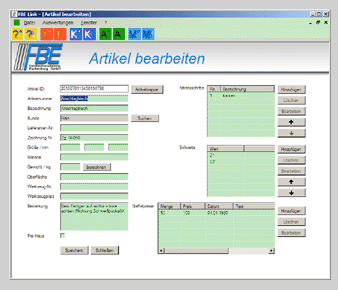 Das Unternehmen Feinblechverarbeitung Eschenburg (FBE) stellt Metallprodukte in zahlreichen Verfahren her: Stanzen, Biegen, Lasern etc. Zur Modernisierung der Auftragsbearbeitung wurde ein datenbankbasiertes System entwickelt: Verwaltung von Artikeln, Mitarbeitern, Anfragen und Aufträgen stellen das Kernprodukt dar. Dazu gehört die Abbildung der Betriebsabläufe von FBE sowie die Erzeugung von Ausdrucken für die Produktion. Als weitere Komponente wurde eine Zeiterfassung für die Produktion entwickelt, zu der geeignete statistische Auswertungen mit Hilfe eigener Programmteile gehören.
